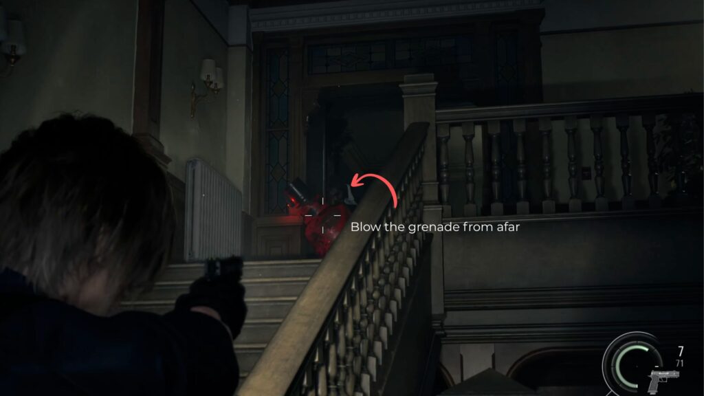 Your next destination is the third floor of the west wing. At the top of the stairs, you’ll find an infected holding a red gas canister that’s beeping. Shoot it from a distance to trigger the explosion safely. Once it’s clear, head up and force open the locked door at the end of the hallway.