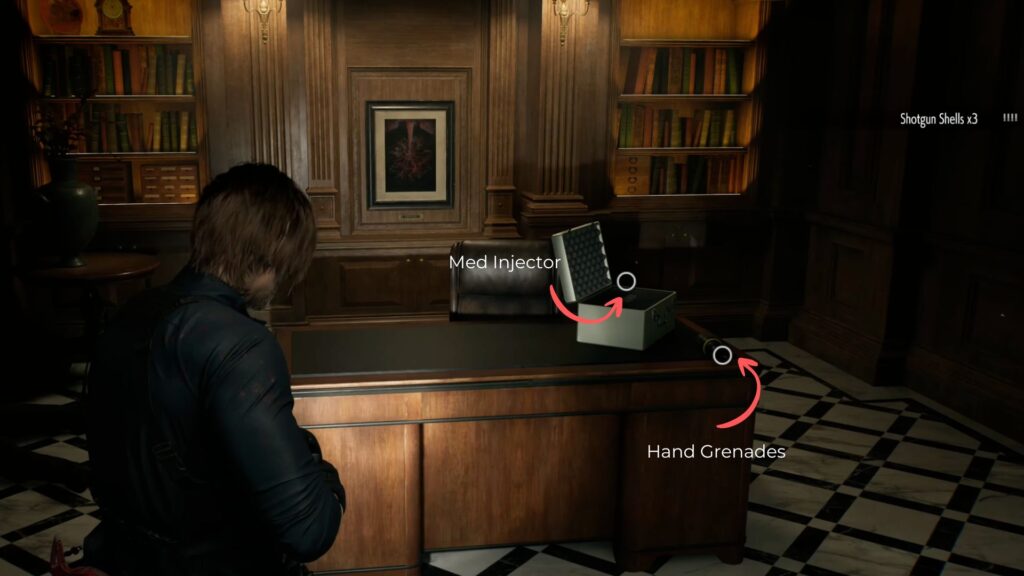 Once the area looks clear, head deeper through the Meeting Room into the Director’s Office. On the table, you’ll find Hand Grenades and a Med Injector, stock up here.