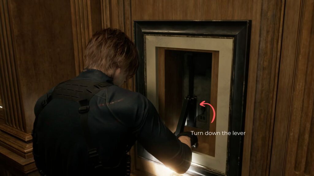 Next, look at the framed picture on the back wall and interact with it to reveal a hidden elevator behind it. Pull the lever down to open the wall panel. While you wait for it to slide open, more Blister Heads will pour in from behind. You need to deal with them before proceeding.