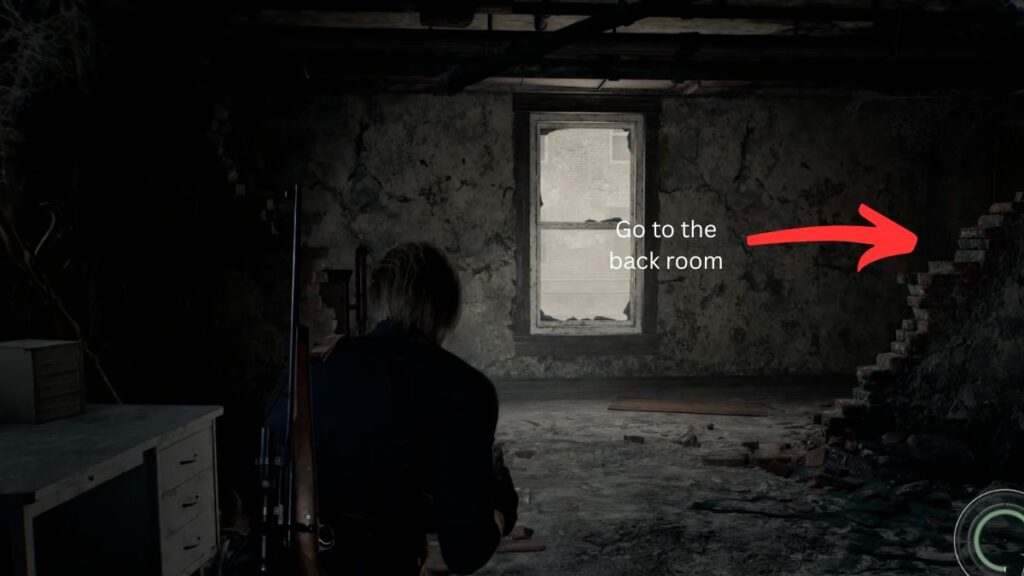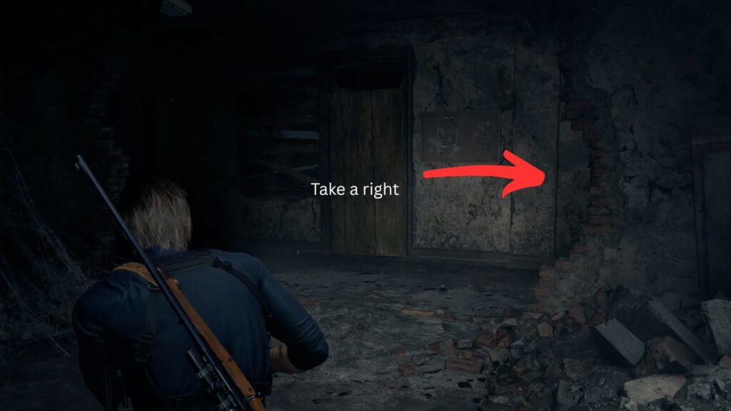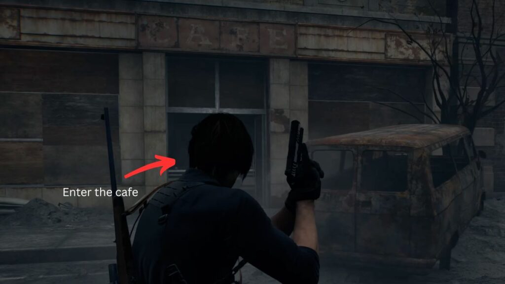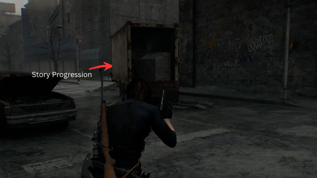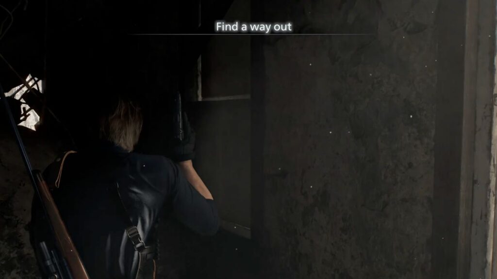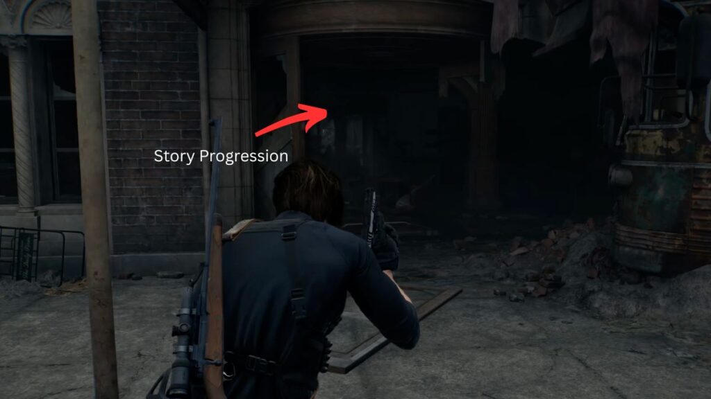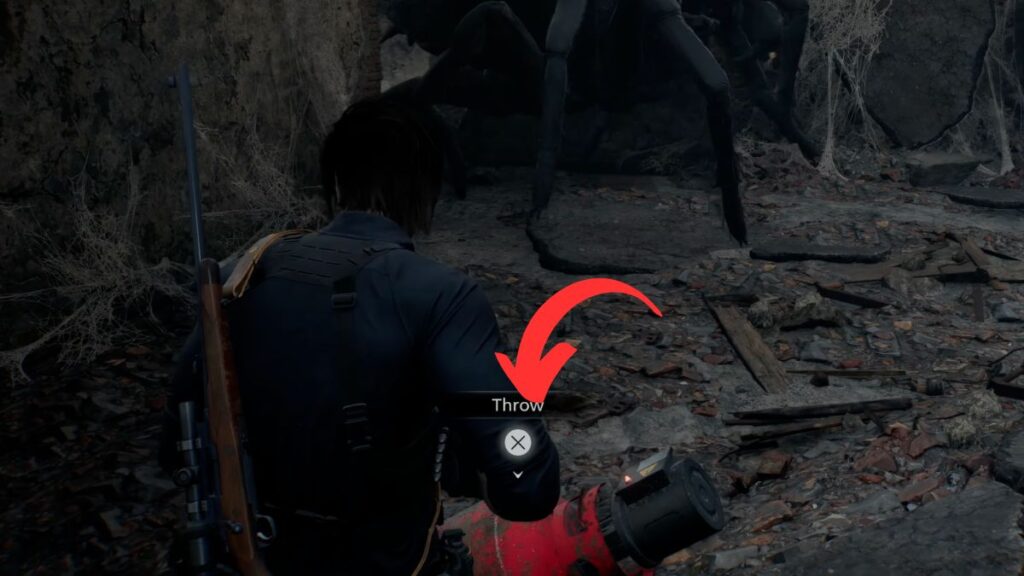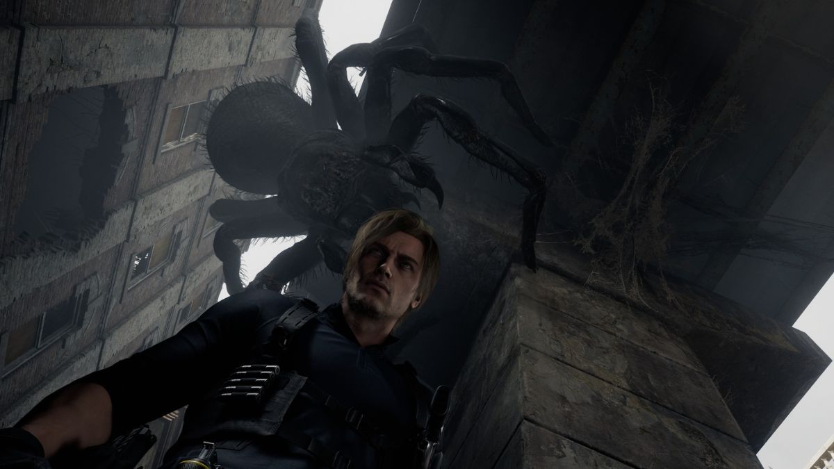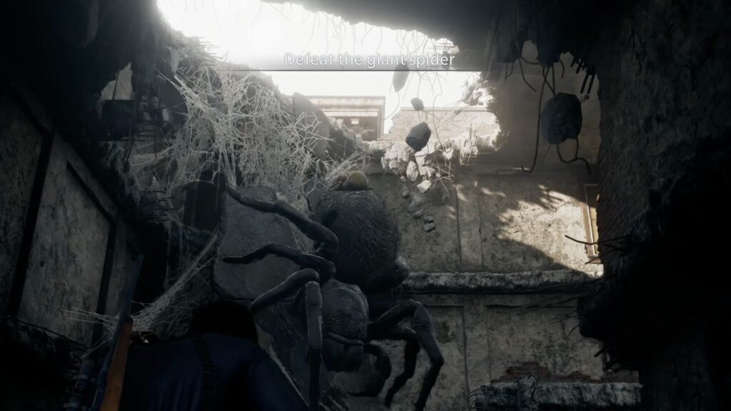 As you exit the building, a cutscene plays, Leon accidentally crushes a skull underfoot, and a massive spider drops from above and lunges at him. He dives into a nearby building but gets trapped when debris collapses behind him. The cutscene ends, and you’ll be prompted to find a way out.