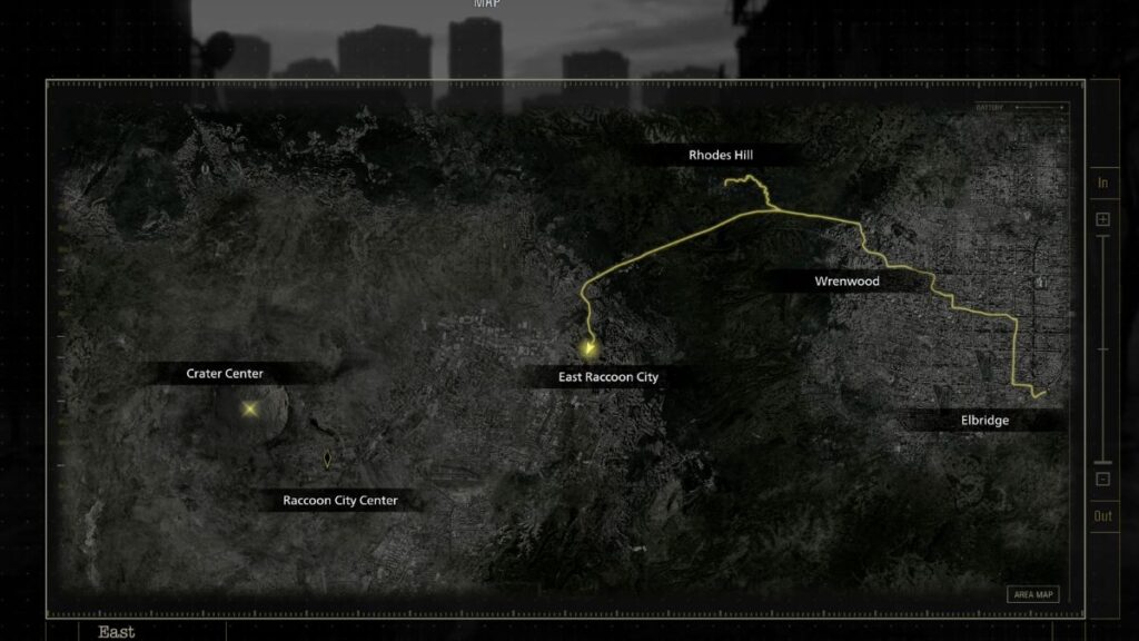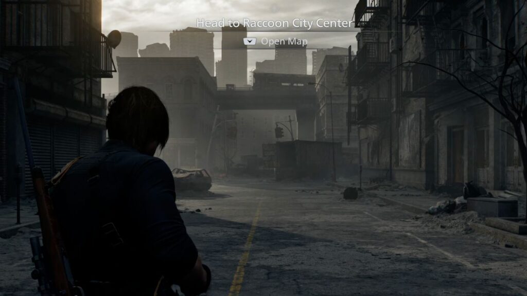 After defeating The Girl, this section opens with a cutscene showing Grace leaving with the unknown man toward Raccoon City, followed by Leon heading there in his Porsche to find her. The scene ends with Sherry saying she may have a lead on their location based on coordinates pulled from Victor’s computer, which is somewhere in the center of Raccoon City. When the cutscene ends, you’re back in control of Leon, now in East Raccoon City.