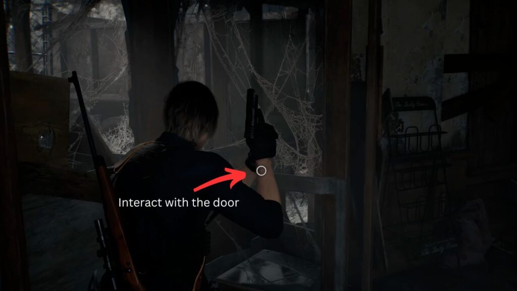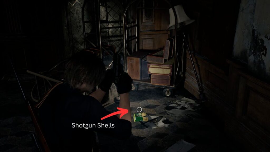 Come back out and continue forward until you spot another open building on the left — Applegate Hotel. Head inside and collect the Scrap (next to the globe), Med Injector (behind the table on the shelves), and Shotgun Shells (in front of the luggage cart) scattered around the area. Make your way to the back portion of the building, where you’ll find a revolving door jammed shut by webs. Interact with it to push through to the other side.
