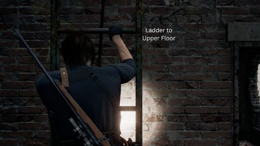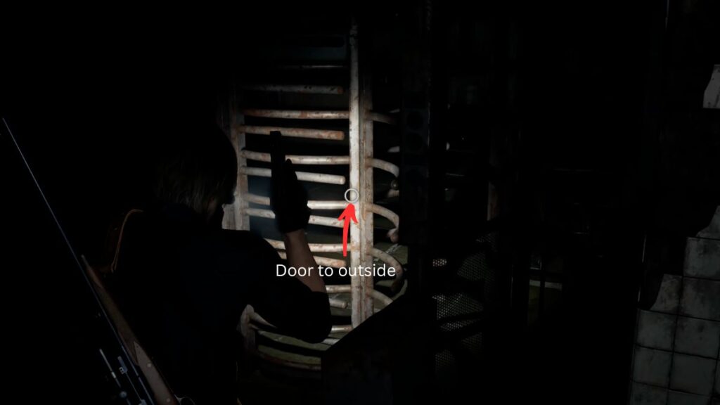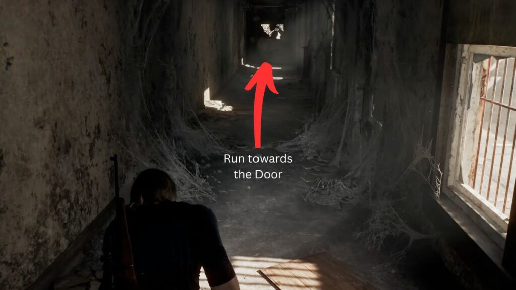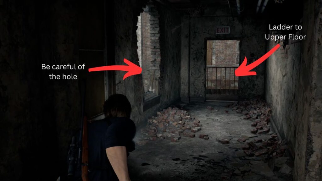 At the far end of the room, you’ll notice a hole in the wall on the left side and a fire escape exit directly ahead on the other side. Make a run for the fire escape, but watch the hole; the spider will lunge through it, so stop before the hole once. Shoot it to drive it back, then climb the ladder up.