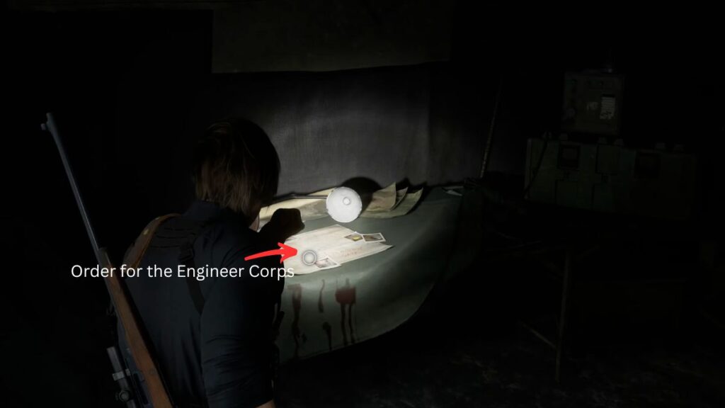 Head down the nearby stairs toward the gate at the bottom , it’s locked, and you’ll be prompted to search the camp. Go back up the stairs and enter the blue tent on the left. Inside, check the left side to find the Order for the Engineer Corps file, which lists the locations of three missing detonator parts needed to get through the main gate: