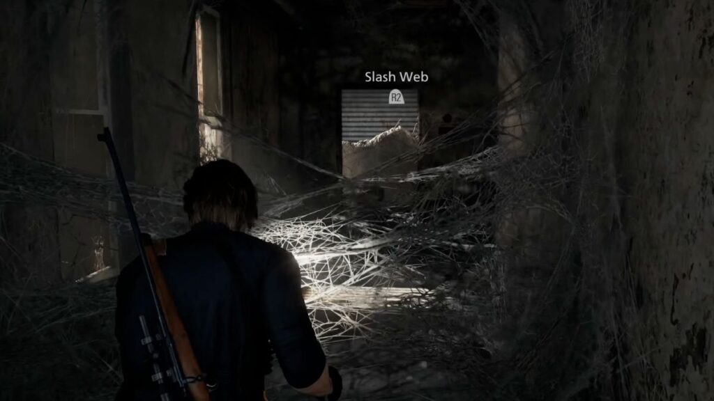 Immediately break the wooden crate to your right to collect Shotgun Shells, then head down the hallway. You’ll need to slash through several webs blocking your path with your Hatchet as you go.