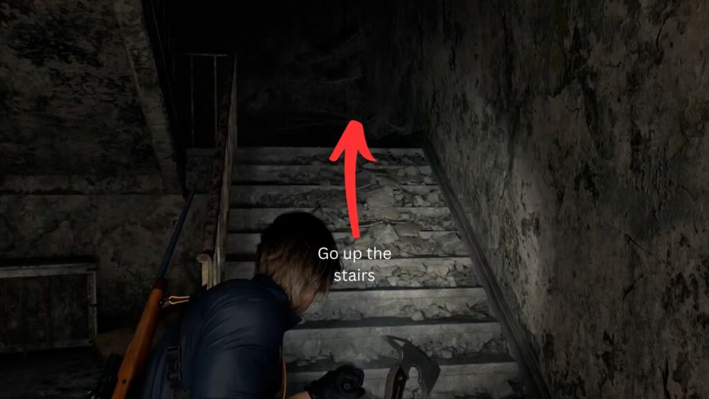 Get back on your feet and look for a nearby room. Head toward it and you’ll spot more webs blocking a path leading to a metal door. Hack through them with your Hatchet and enter the building. Take the stairs up, and you will reach a room. Right at the entrance, break the wooden crate to find Handgun Ammo.