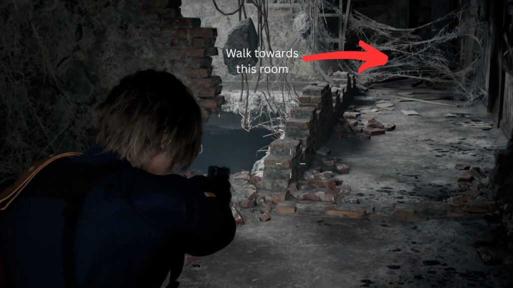 After the first right turn, the titan spider will smash through the wall directly in front of you. Turn around and run back the way you came immediately, but it will catch up regardless and hurl Leon through a brick wall into the next room.