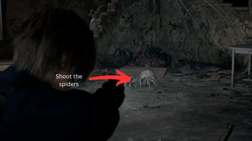 There are multiple crates around the arena, break them regularly to restock ammo and make sure you don’t run dry mid-fight. After you deal enough damage, a cutscene will play showing the spider charging directly at Leon before the floor collapses under both of them. They fall together, and when they hit the bottom, Leon finishes the spider off with his Hatchet.