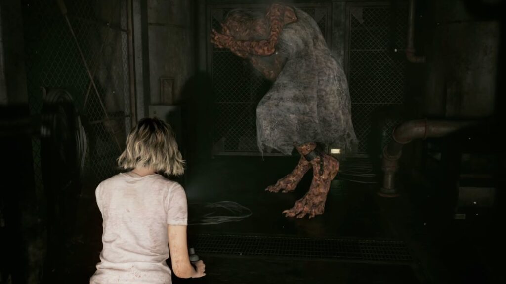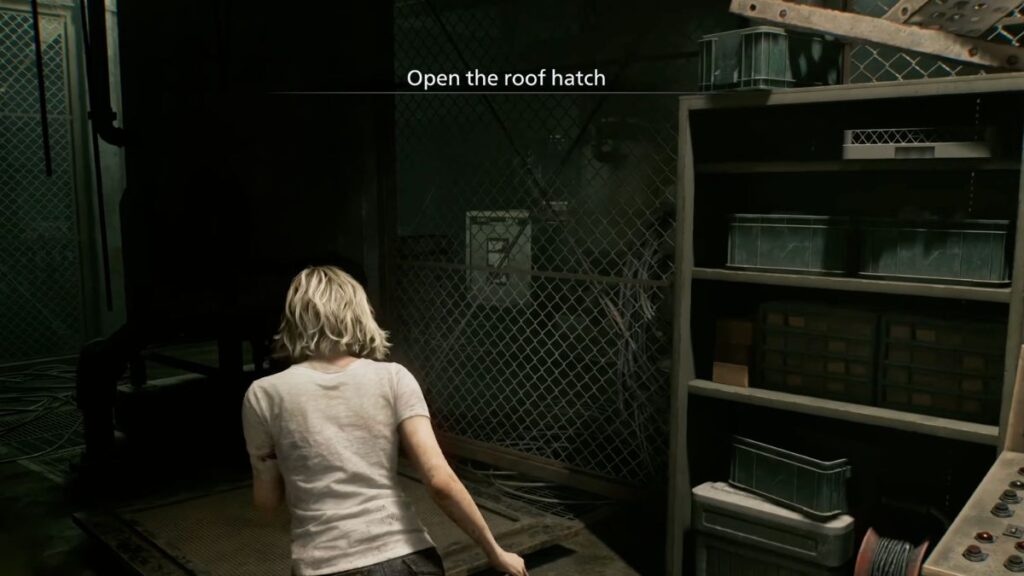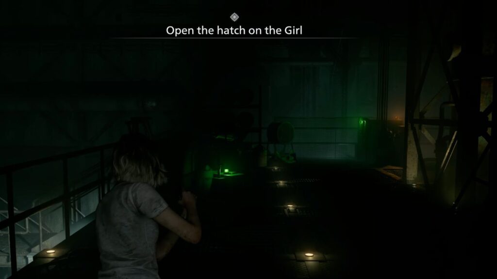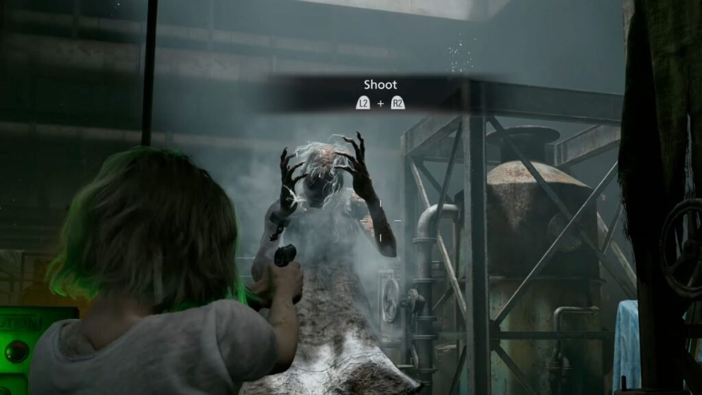 With all three generators running, head back up to the roof controls and begin activating the hatch. The Girl will attack you while you’re working — keep holding on and don’t let go. The hatch will swing fully open, and sunlight will flood the area, stunning the Girl and burning her. The moment she’s burning, aim with L2 and fire with R2. Keep shooting until she goes down. Once she’s defeated, you’ll be prompted to return to Emily.