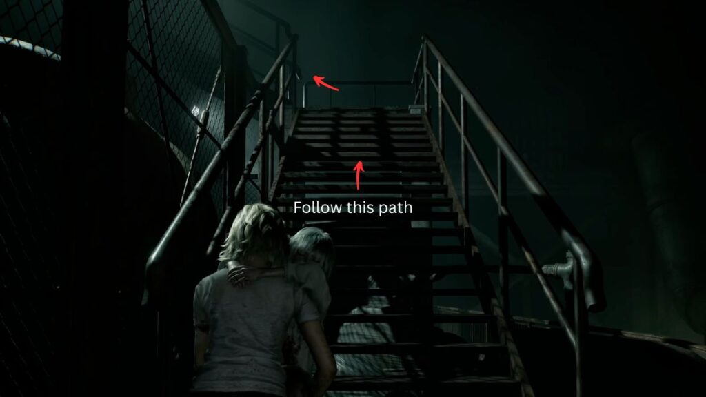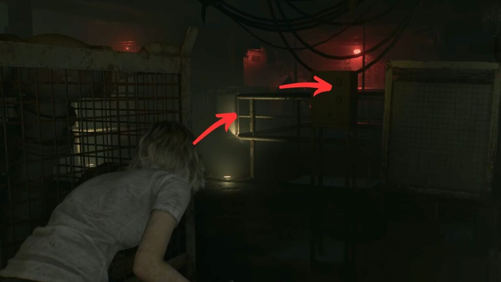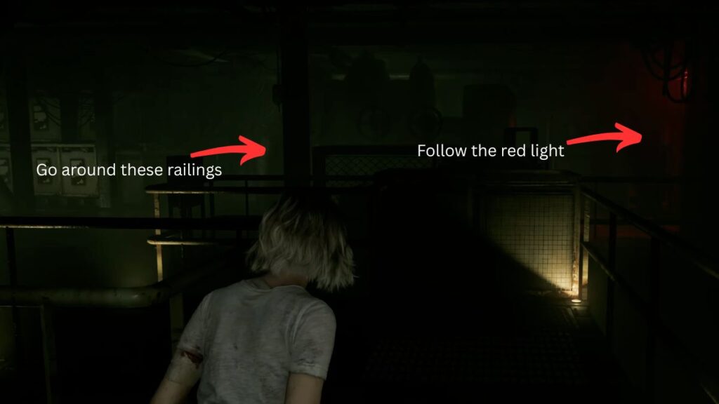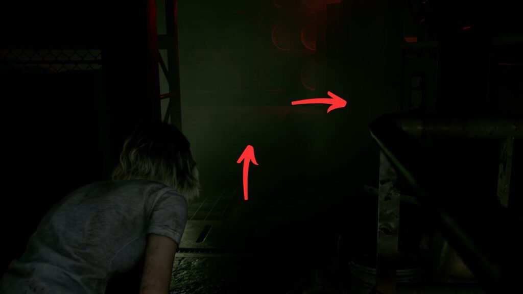 Take a right from the roof controls and follow the red lighting until you spot a staircase beside the railing. Drop down. As soon as you land, you’ll find more Requiem Ammo nearby. Take a right and prepare to navigate the lower floor carefully — the Girl is down here, so stay crouched as much as possible to avoid drawing her attention.