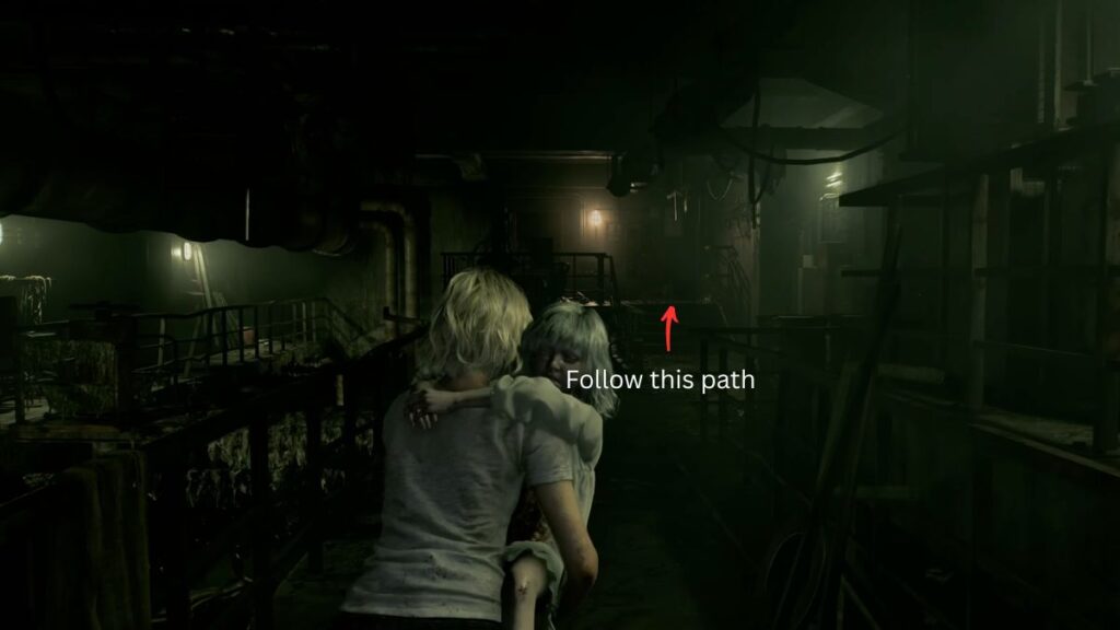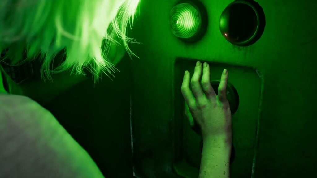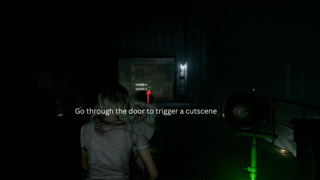 The path forward is largely linear, so keep moving along the main route. You’ll soon come across a staircase, head up, and you’ll reach a panel with green lights. With Emily in your arms, you won’t be able to interact with it, so keep going. Head through the large door in this area, and a cutscene will trigger. Grace spots the Girl lurking nearby and makes up her mind that she has to deal with the Girl herself if she wants to protect Emily. She sets Emily down on a metallic platform, and the cutscene ends.