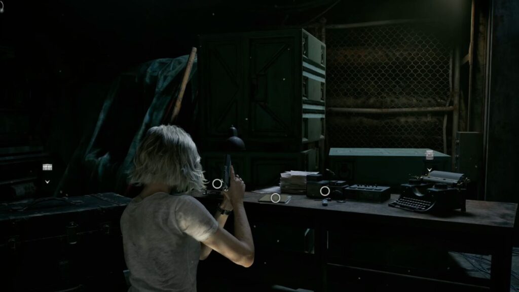 Once you’re back in control, check the area around you before heading out. On the table directly in front of you, there’s a Roof Hatch Manual file. On a nearby barrel, you’ll find a Transfusion Bag and a Med Injector, along with a full set of 5x 12.7x55mm Ammo for the Requiem Revolver. There’s also a typewriter here where you can save your progress before continuing.